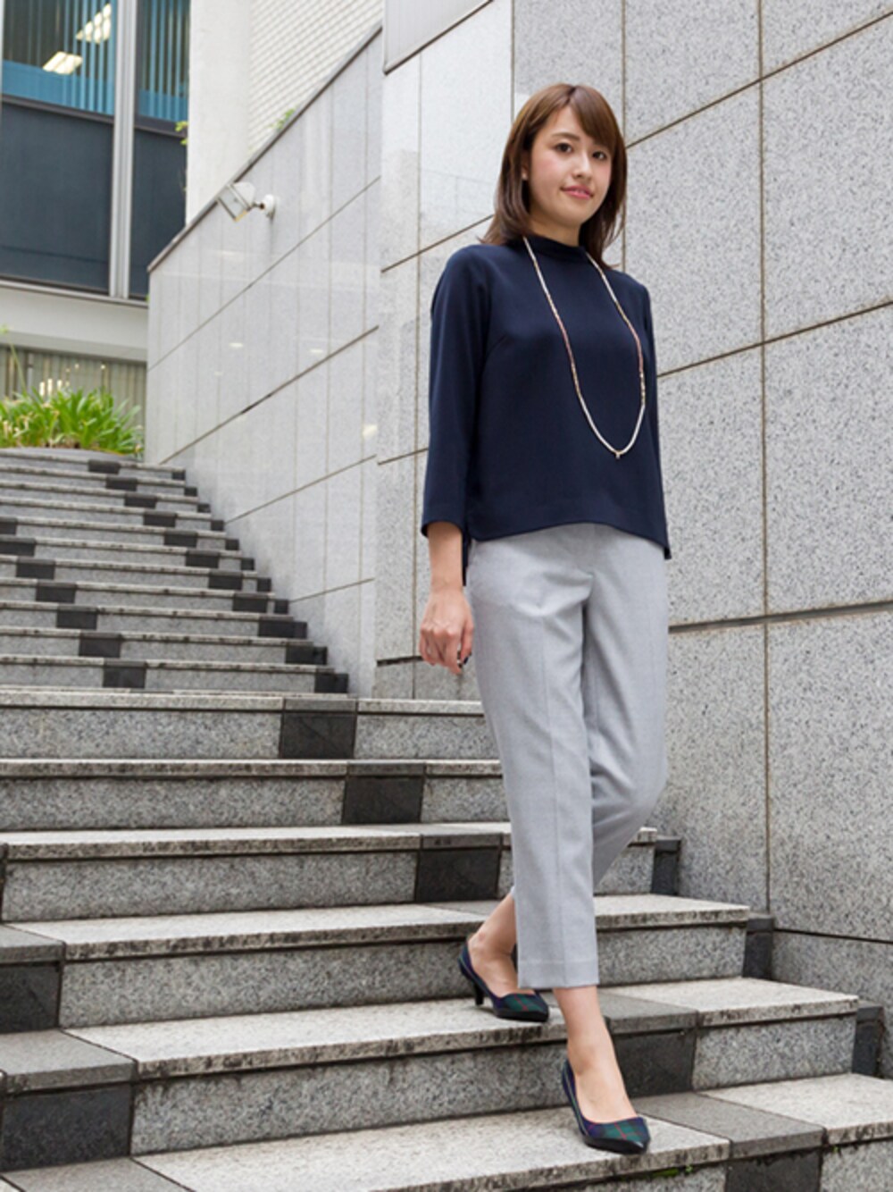 通勤パンツスタイルは、くるぶしの見えるクロップドパンツや、今年らしいハイネックブラウスで女性らしくがポイントです。