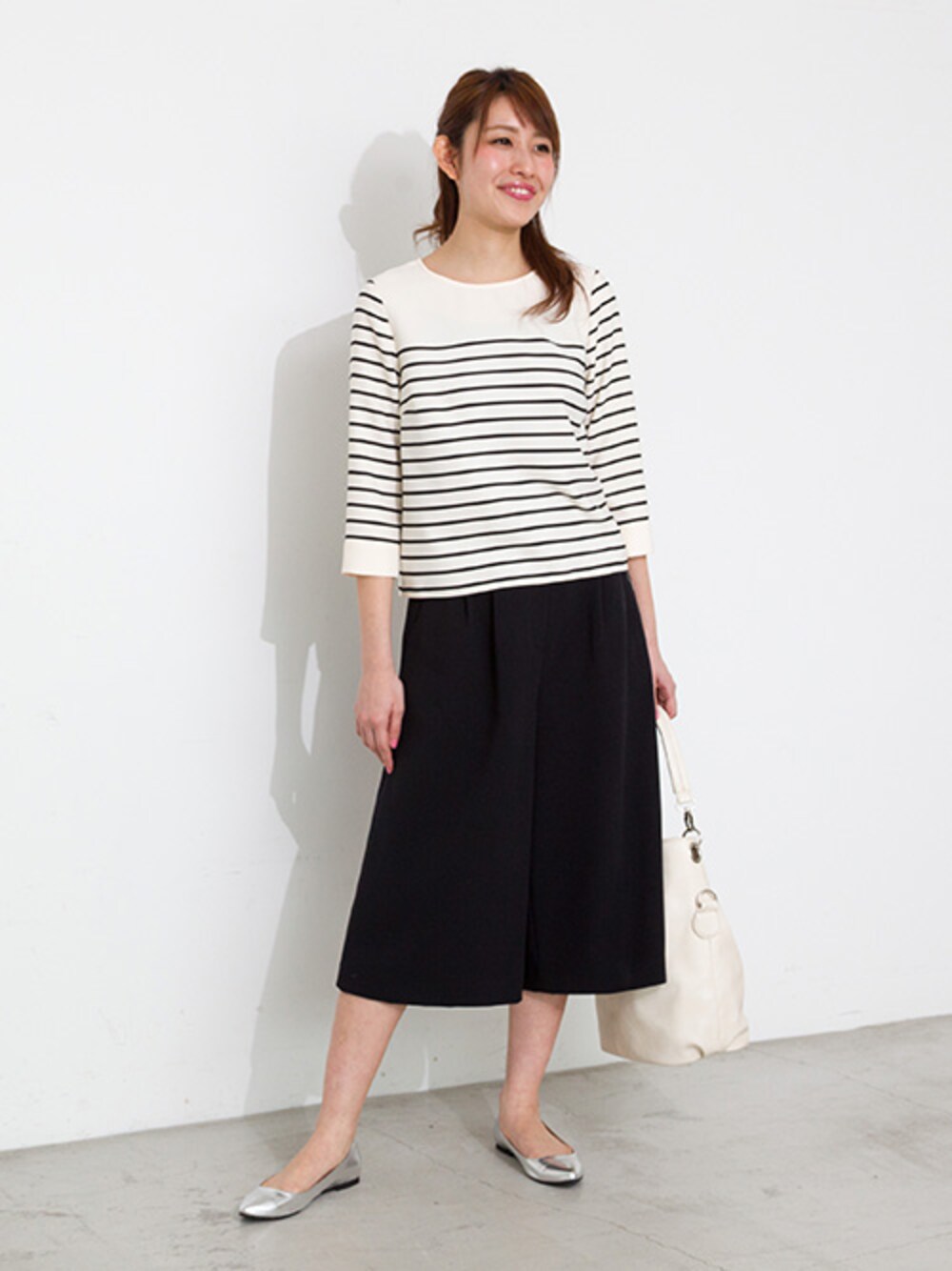 ガウチョパンツの通勤コーデ。 すっかり定番化したガウチョパンツは通勤スタイルにも取り入れたい。 モノトーンでまとめたスタイルにシルバーのフラットシューズがこなれ感をプラスしてくれます。