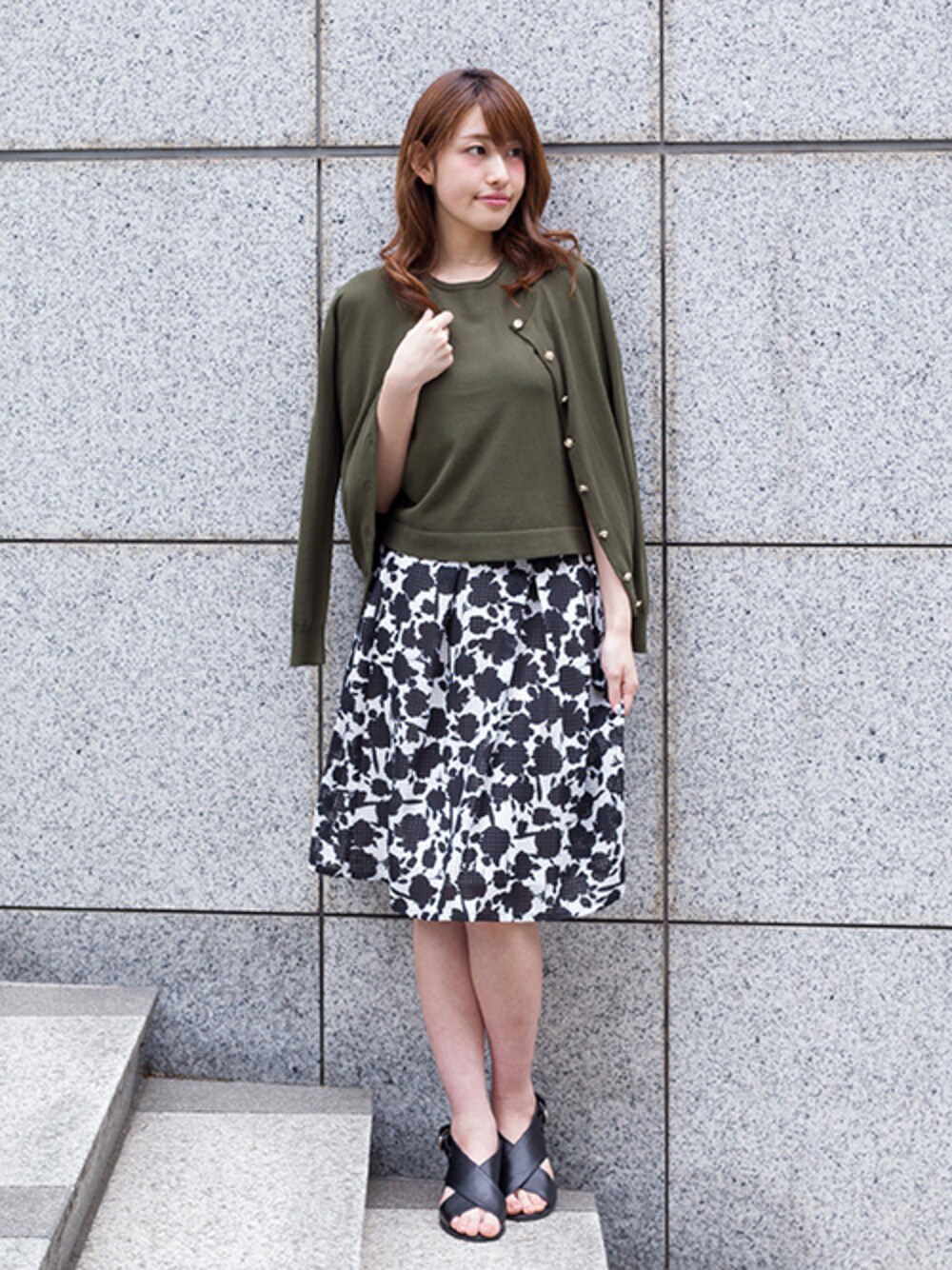 UV CUTツインニットの通勤コーデ フェミニンなフラワープリントスカート合わせなら、カーキ×モノトーンでまとめて大人っぽく。