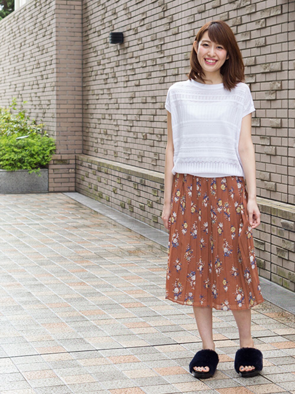 レトロなフラワープリントスカート。今季注目のファーサンダルを合わせたミックストレンドスタイル。