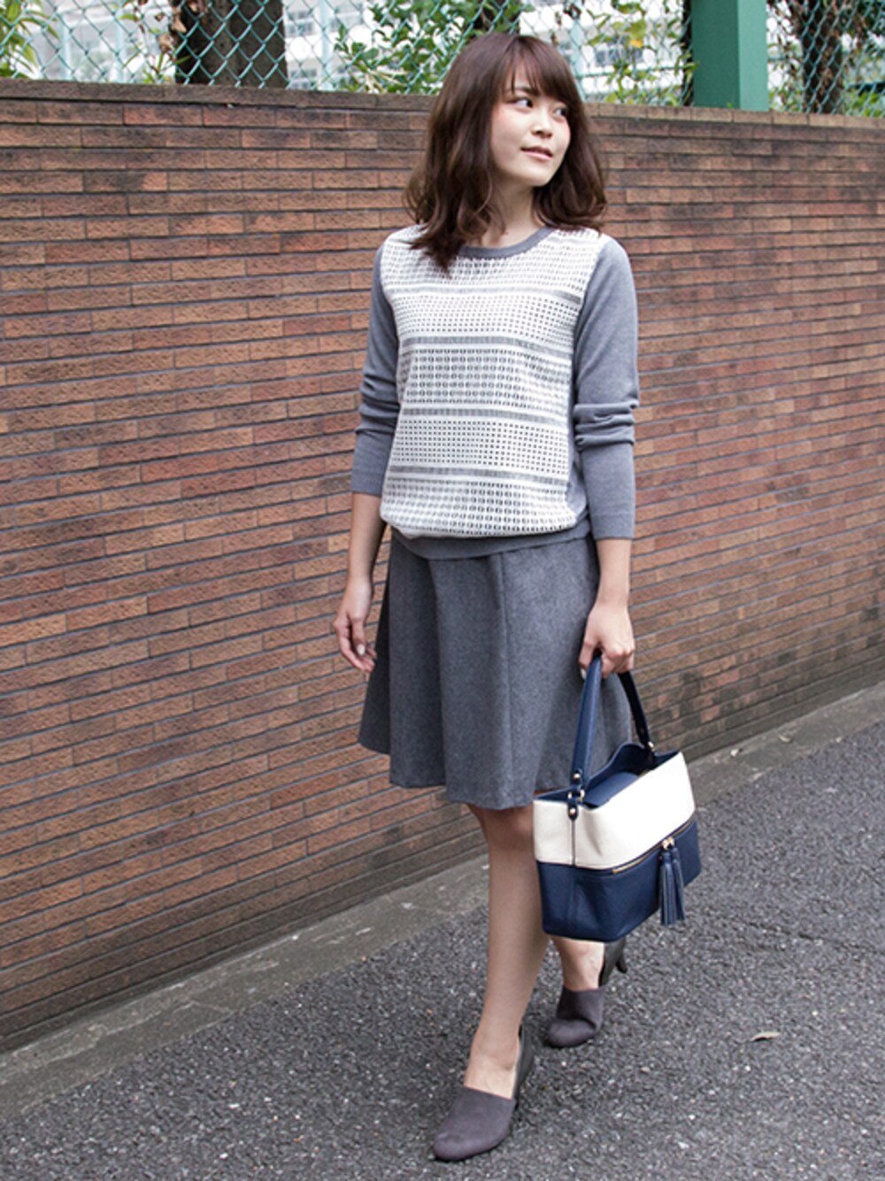 通勤スタイルに欠かせない膝丈フレアスカート。 グレーでまとめて清楚スタイルに。