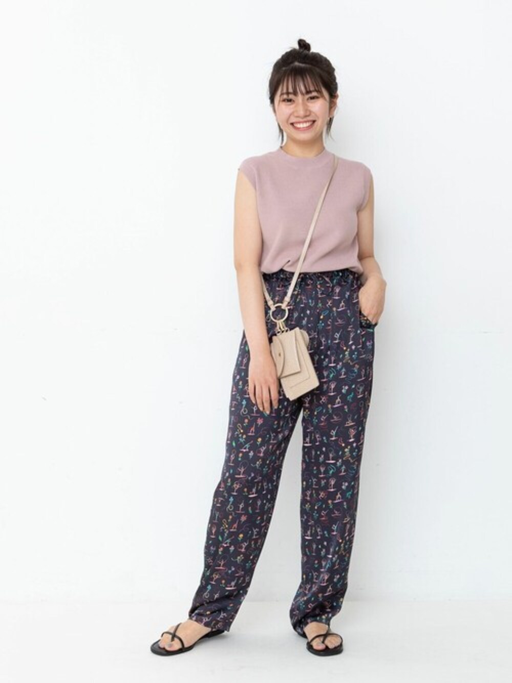 新体操の絵柄が愛らしいリバティープリントを使った1枚主役のリラックスパンツ。程よい光沢感でカジュアルすぎないのも今気分です。フィット感のあるコンパクトなトップスと合わせて大人カジュアルな雰囲気に。