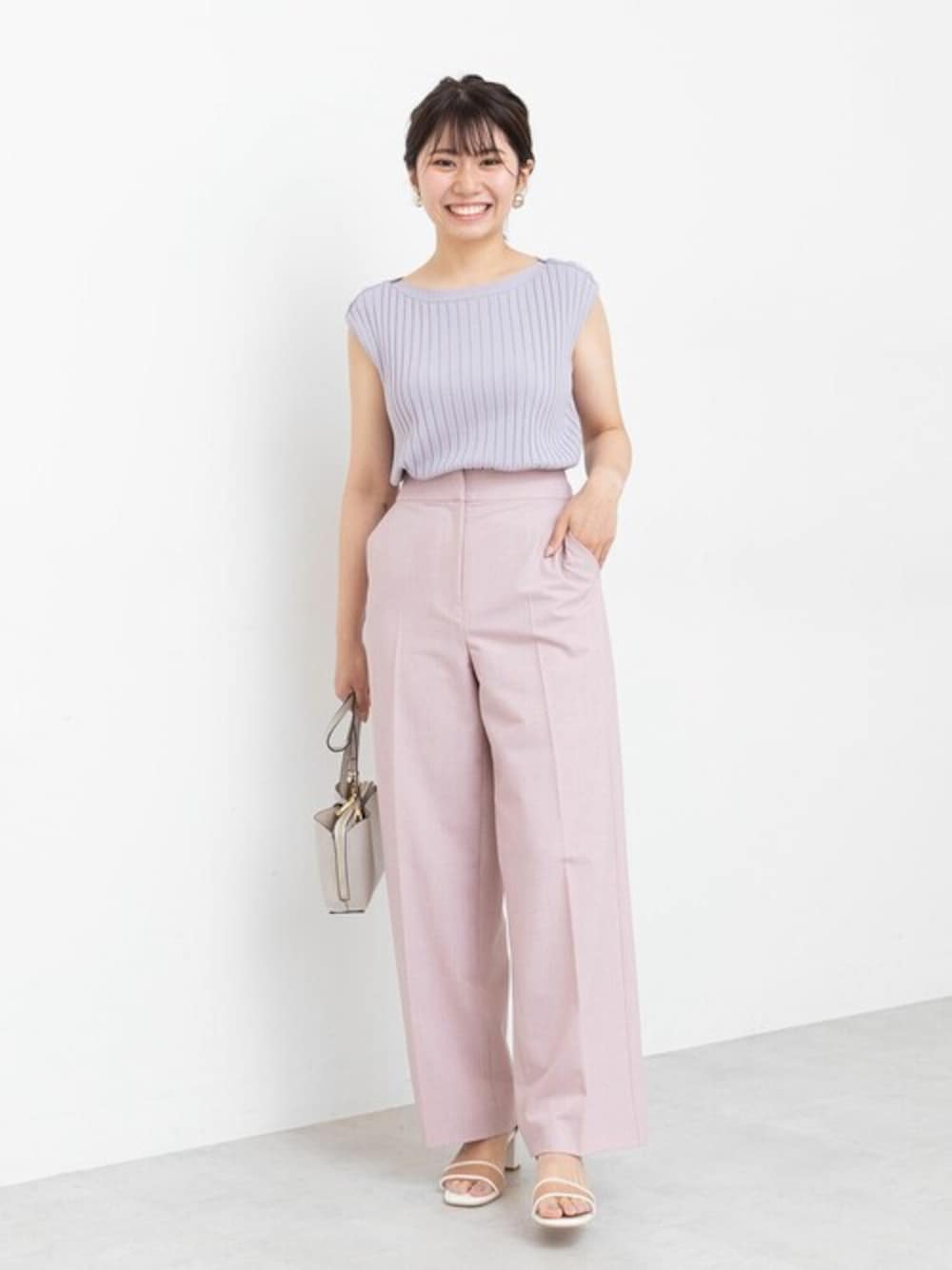 ラベンダー×ピンクをワントーンでまとめて華やかで遊びのある色合わせのコーディネートに。程よいフィット感のあるトップスをインスタイルですっきりと見せることで、甘めカラーもシャープに着こなせます。