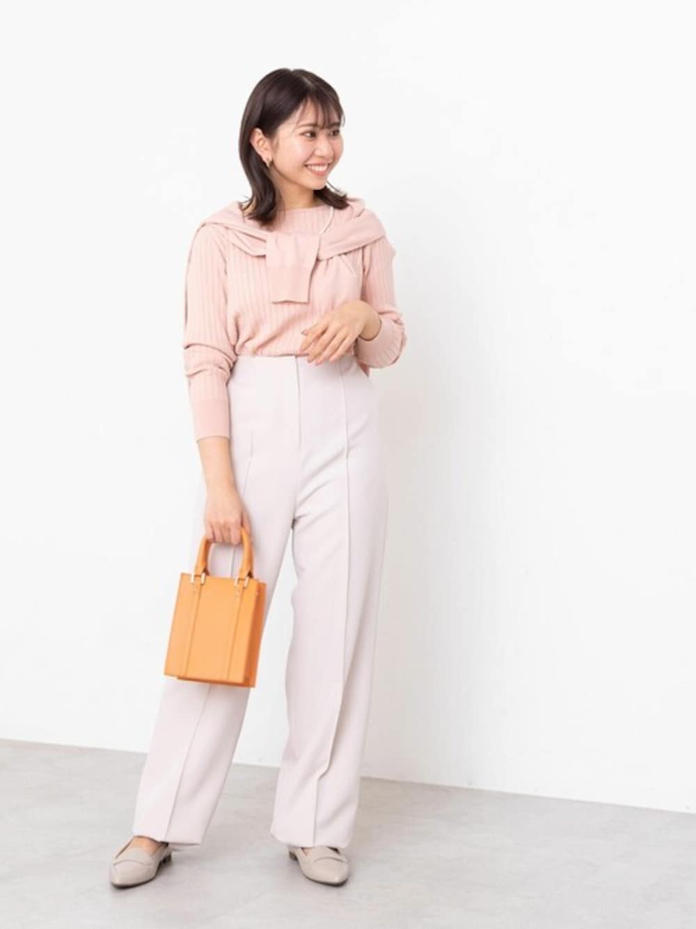 ベーシックなニットアンサンブルとパンツでオフィススタイル♪ニットを春色に変えるだけで、シンプルなオフィススタイルもアップデートできます!コートを着るときはストール代わりにコートの上からカーディガンを巻くのも今っぽくって◎