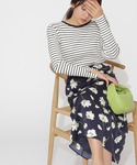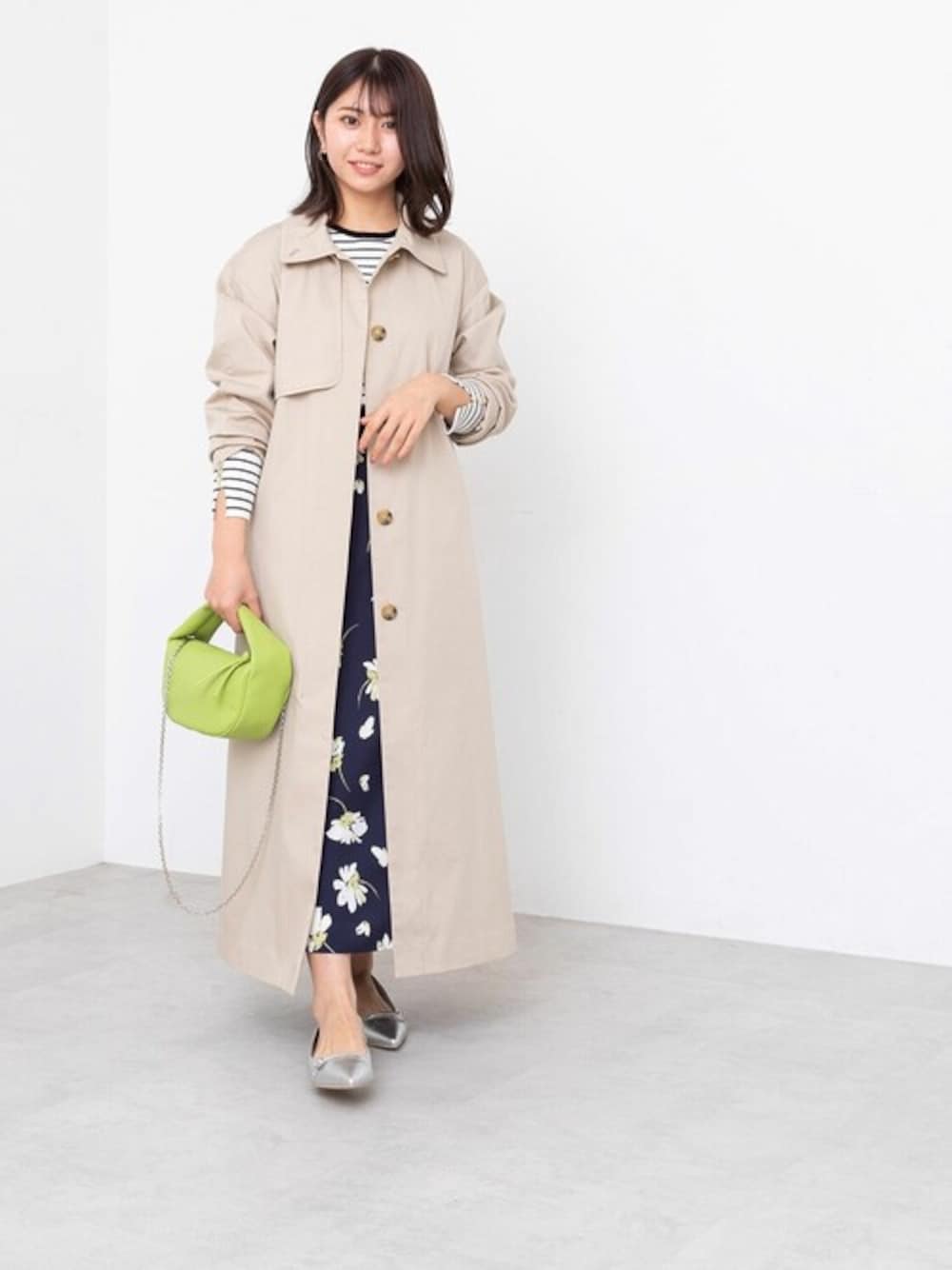 オフィスにはもちろん、休日スタイルにもおすすめのON・OFF使えるステンカラーコート。柄×柄のきれいめカジュアルスタイルにさらりと羽織るだけで、大人顔にみせてくれます。コーディネートのカラーは抑えめにしたので、小物で春らしいカラーをプラスしてみました。コートは149cmでMサイズを着用した着丈感です。低身長さんはSサイズでも良さそうです。