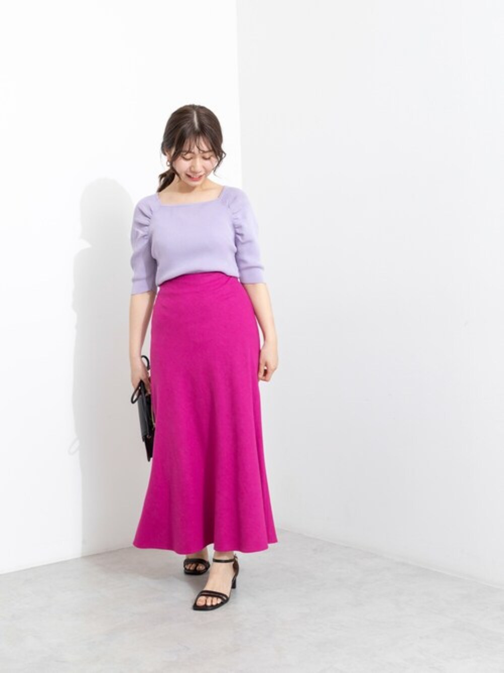 主役は鮮やかな目を惹くピンクのナロースカート♪バイアスに生地をとっているのでほんのりとフレアラインがでて軽やかさもあります。暑くなる季節、ビビットカラーでも麻混素材なのでナチュラル感がプラスされ印象が強くなりすぎないので挑戦しやすいのもポイント。同系色でまとめればコーディネートも簡単。パワーショルダーが女性らしいコンパクトニットあわせならオフィスカジュアルにもおすすめです!黒小物で締めれば大人っぽくまとまります。