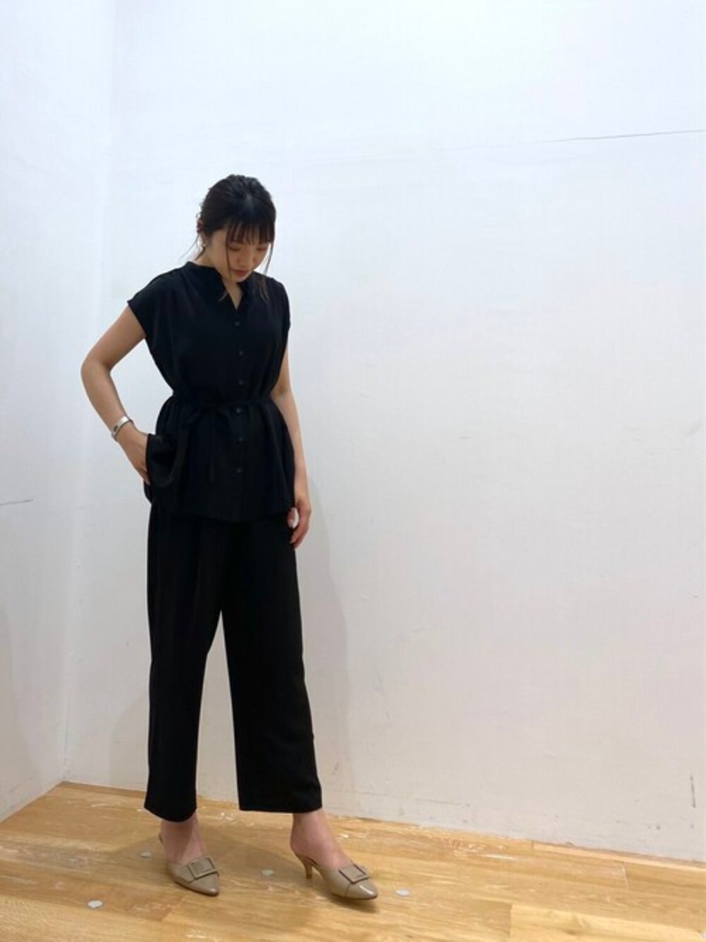 二の腕をカバーできるフレンチスリーブにヒップをカバーできるチュニック丈のブラウスは共布のベルト付きでメリハリを付けられ、スタイルアップが叶う一枚です。 セットアップのパンツも太すぎないストレートシルエットでスッキリ履いて頂け、足首が見える丈なので、カチッとした印象のブラックコーデに抜け感をプラスできます。 ブラウスのボタンは一番上まで留めても上品ですが、私は骨格ストレートなので、ボタンを2つ開けてスッキリ着てみました。 ----------------------------------------------------------- 【着用サイズ】 ブラウス:M パンツ:M ミュール:L ************************** 【普段サイズ】 トップス:M ボトム:S シューズ:23.5/L(幅広)