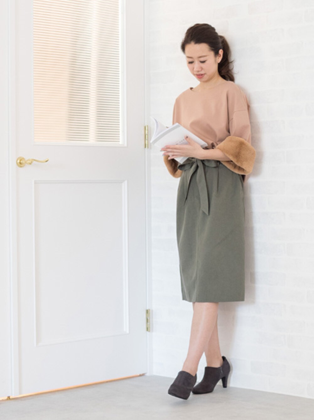 今年もエコファーアイテムはチェックしておきたい。シンプルなポンチのトップスの袖口に風合いの良いエコファーをプラス。ハイウエストのベルテッドスカートにインしてコンパクトにこなして。