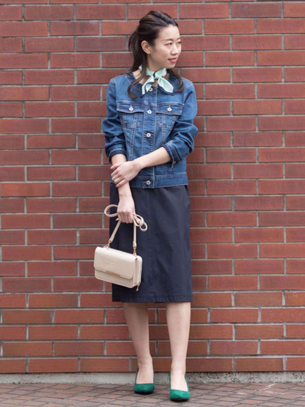 カジュアルな印象のGジャンも、ノーカラーを選べば、ベーシックなタイプと比べまた違った雰囲気に。 首元はスカーフでアクセント♪レディライクに仕上がります。