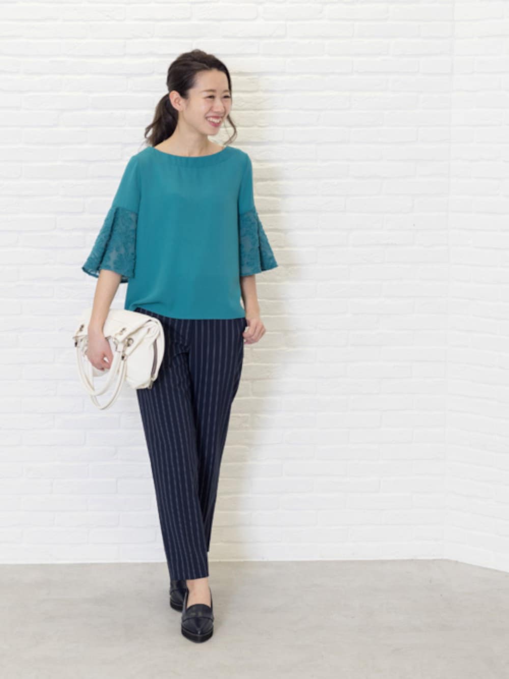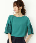 スリーブ部分の素材を変え、カットジャガードのフラワー柄にすることでシンプルながら華やかな印象のフレアブラウス。いつものパンツスタイルがぐっと上品に。