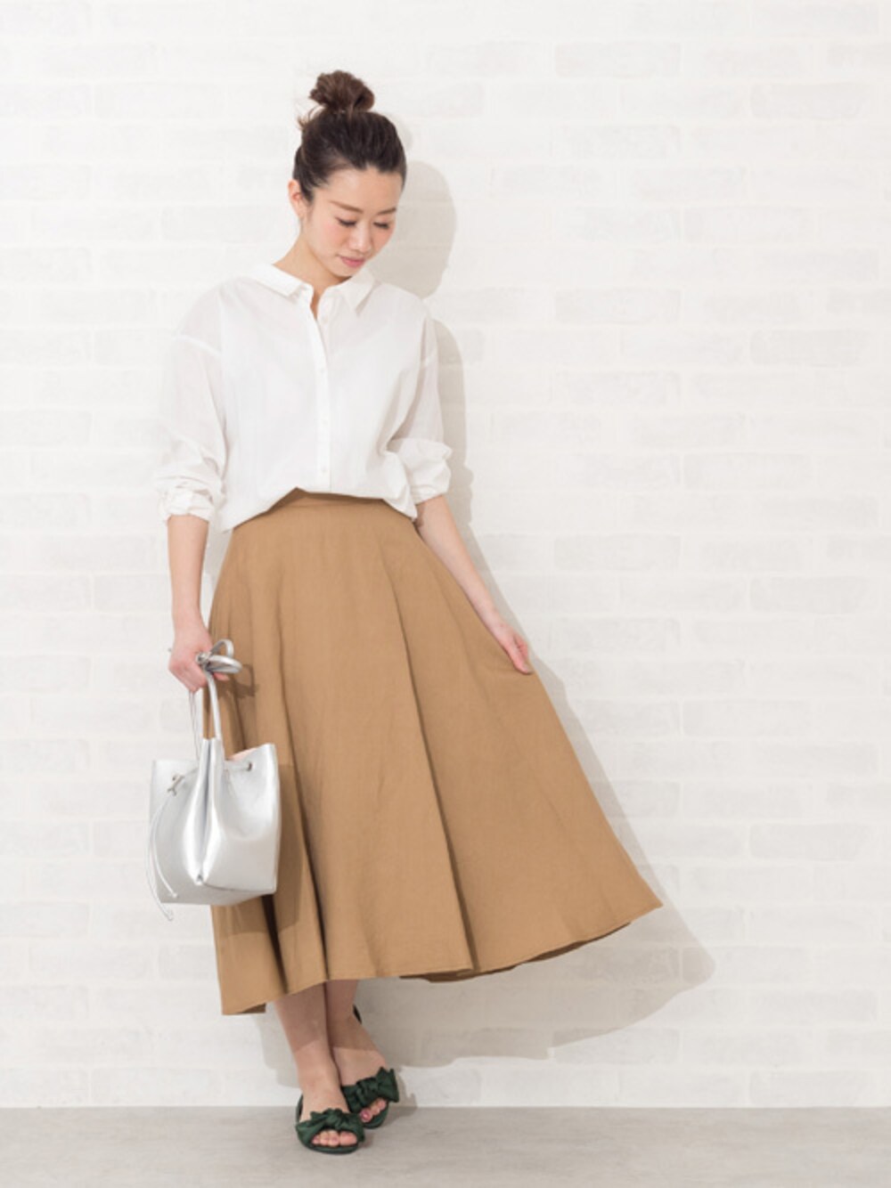 バックのレースアップがポイントのブラウスは、フロントはシンプル見えで着回ししやすいのがポイント♪フェミニンなミディスカートには白を選んでシンプルにまとめます。