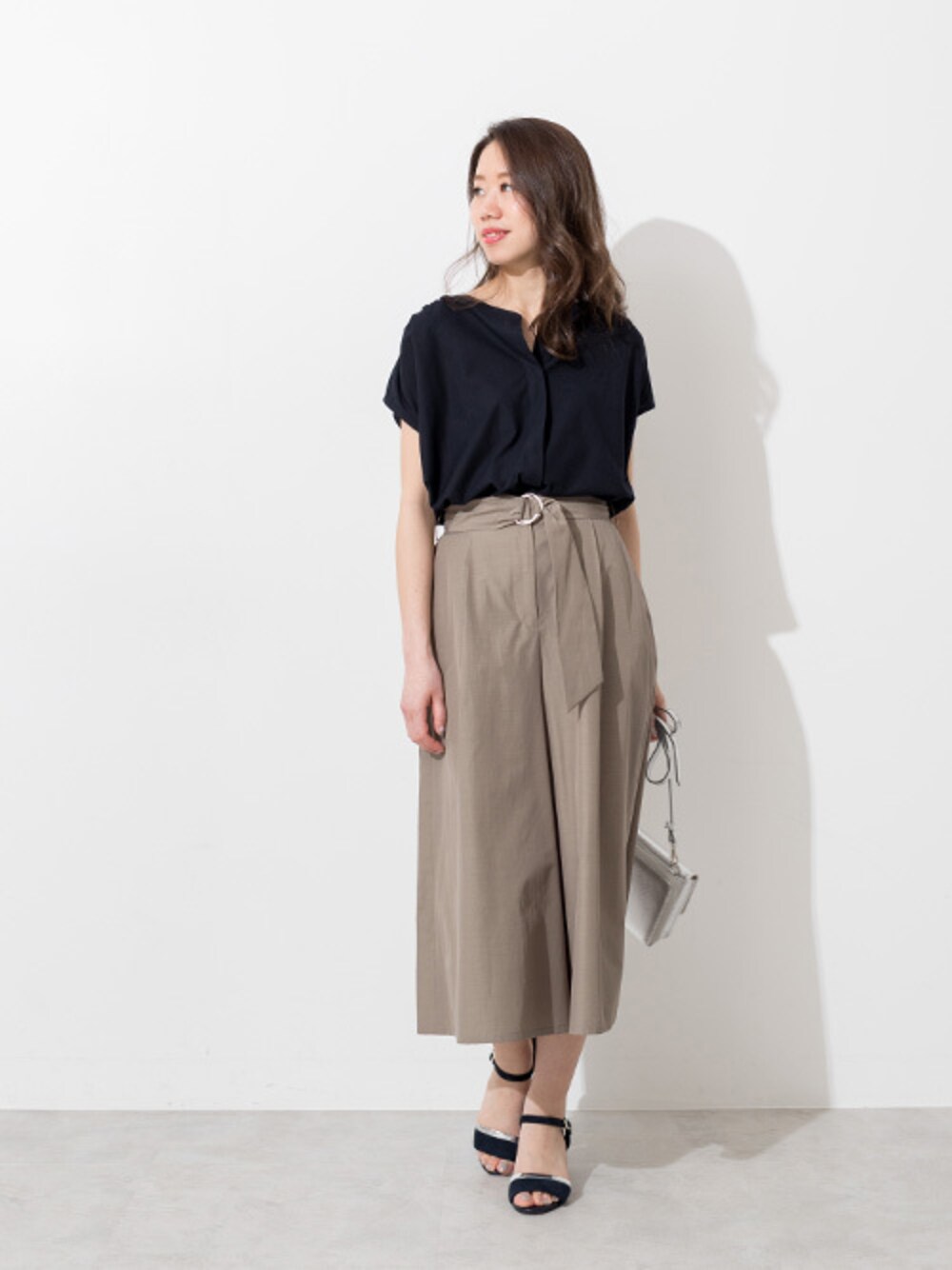 夏らしいライトカーキのガウチョパンツは、ブラックと合わせてシックにまとめます。