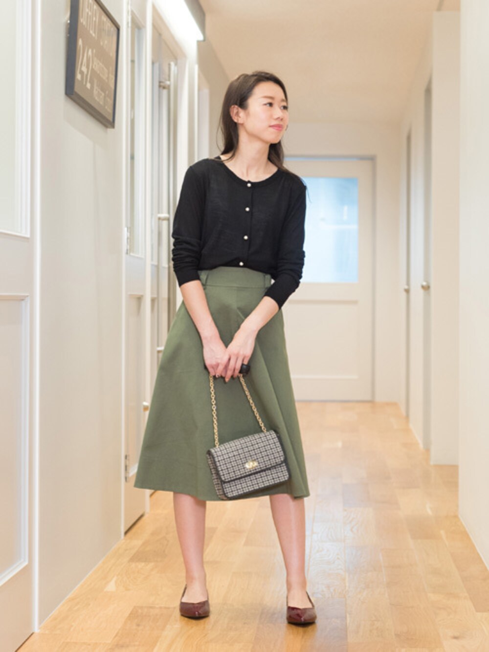 ベーシックアイテムはさり気ないデザインディテールで差をつけて。パールボタンがポイントのシルクタッチのカーディガンは前をとめてトップスとしてももちろん、軽いので夏の冷房対策にカバンに常備もおすすめです。
