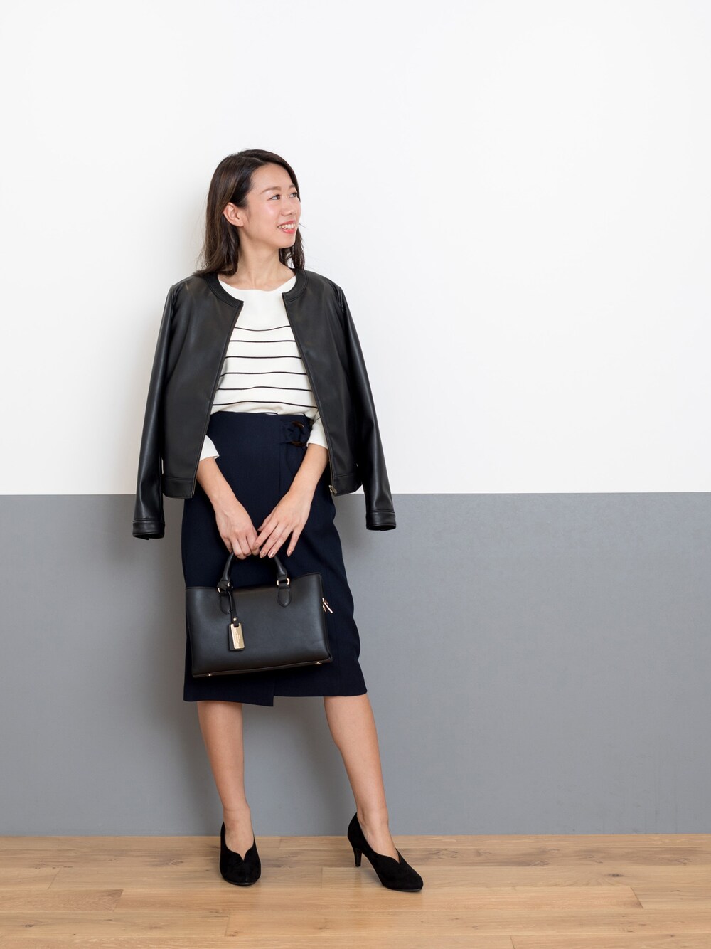 コンパクトデザインで女性らしく決まるフェイクレザーブルゾンは、きちんと通勤スタイルの羽織にもおすすめです♪