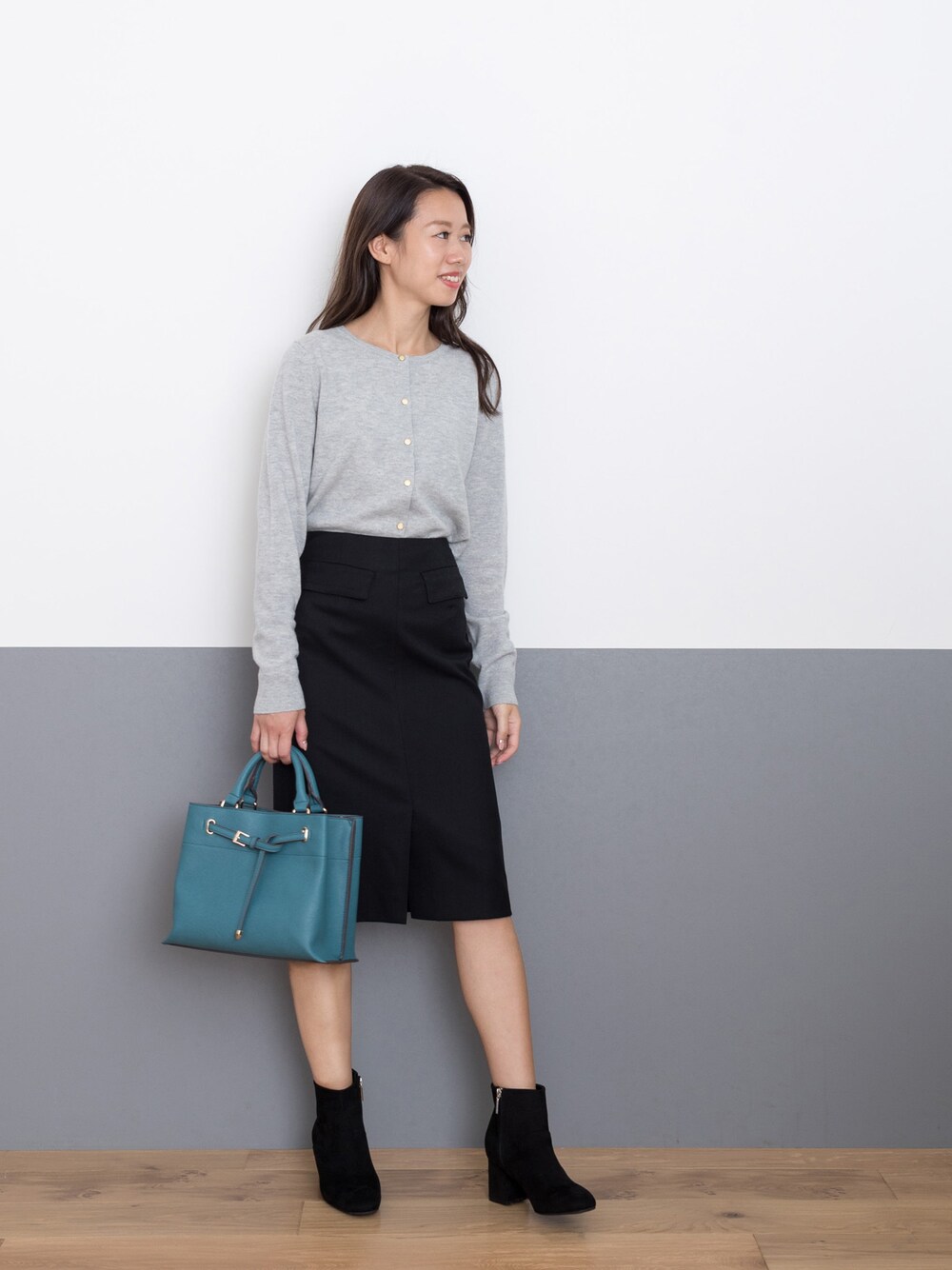 カーディガンは、フロント釦をとめてプルオーバー風にが気分♪シンプル通勤コーデ。