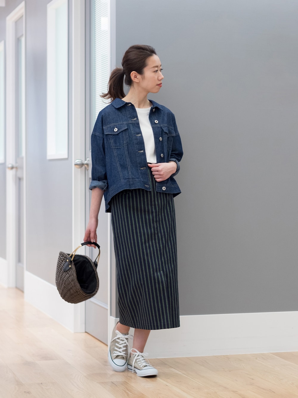 長めのストレートスカートは、ストライプ柄で縦のラインを強調してスタイルアップ♪スニーカー&Gジャンでラフにこなせば休日カジュアルスタイルに♪