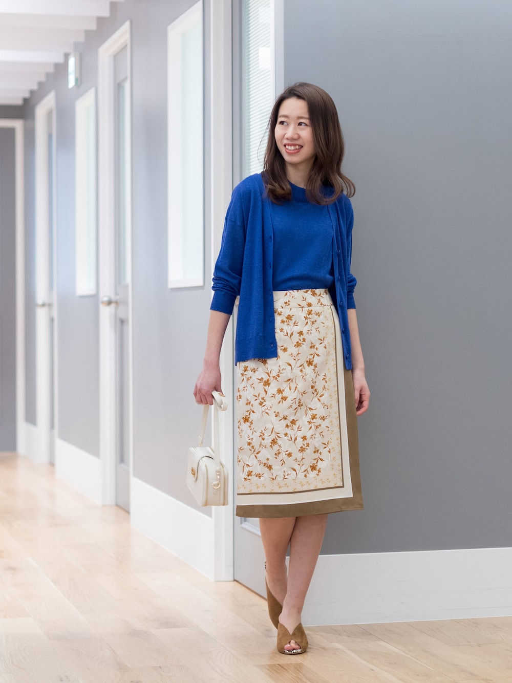 通勤スタイルにおすすめ♪ウォッシャブルリネンのアンサンブル。上品なロイヤルブルーには、スカーフ柄スカートを合わせてレディにまとめます。