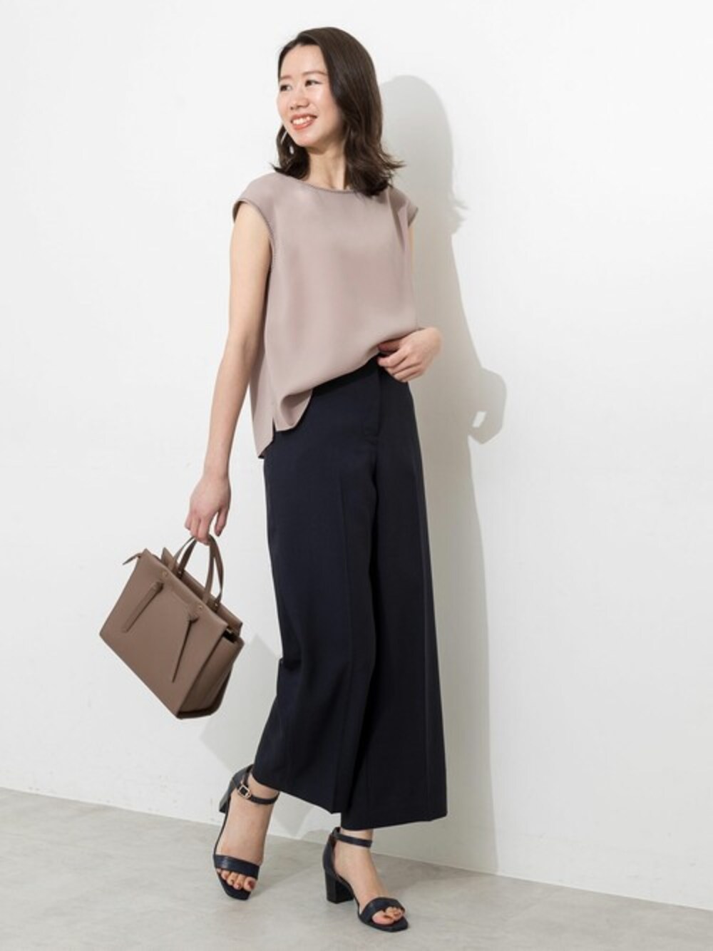 シンプルなフレンチスリーブのブラウスは、バイカラーのステッチをジグザグに襟と袖口にいれたデザインがアクセントに。シワにもなりづらい素材でテレワーク映えもする1枚。ステッチにあわせた黒のセンタープレスパンツをあわせて大人顔コーデに。