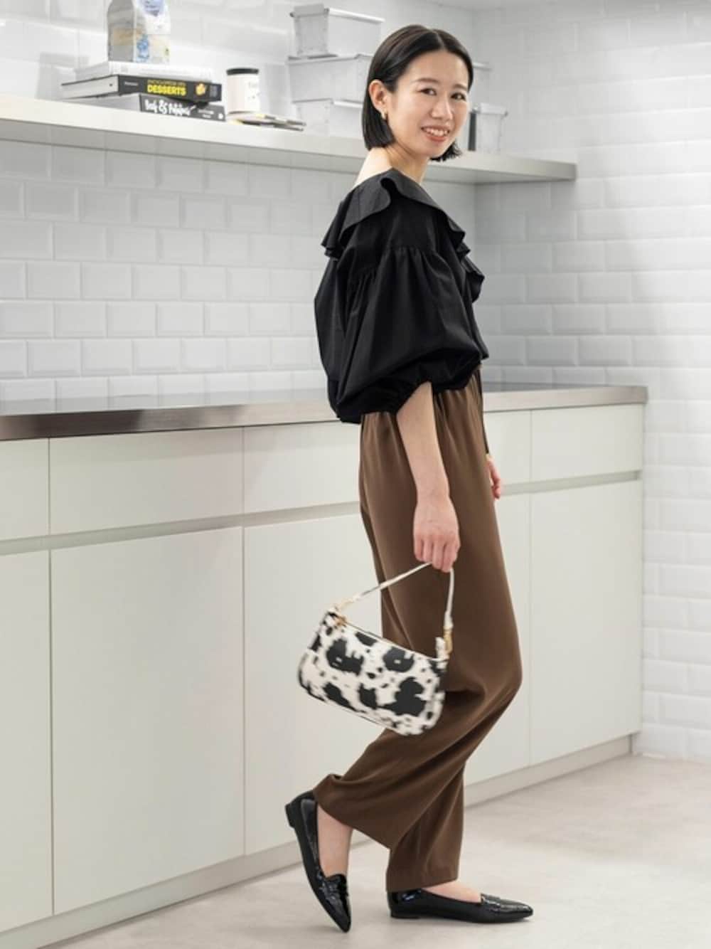 ラッフルカラーと袖にボリュームを持たせたブラウスはトレンド感のある1枚。ダークカラーコーデで甘くなりすぎないスタイルに。程よい光沢感のあるサテンパンツはゆるりとはけるのにすっきり上品見えします。
