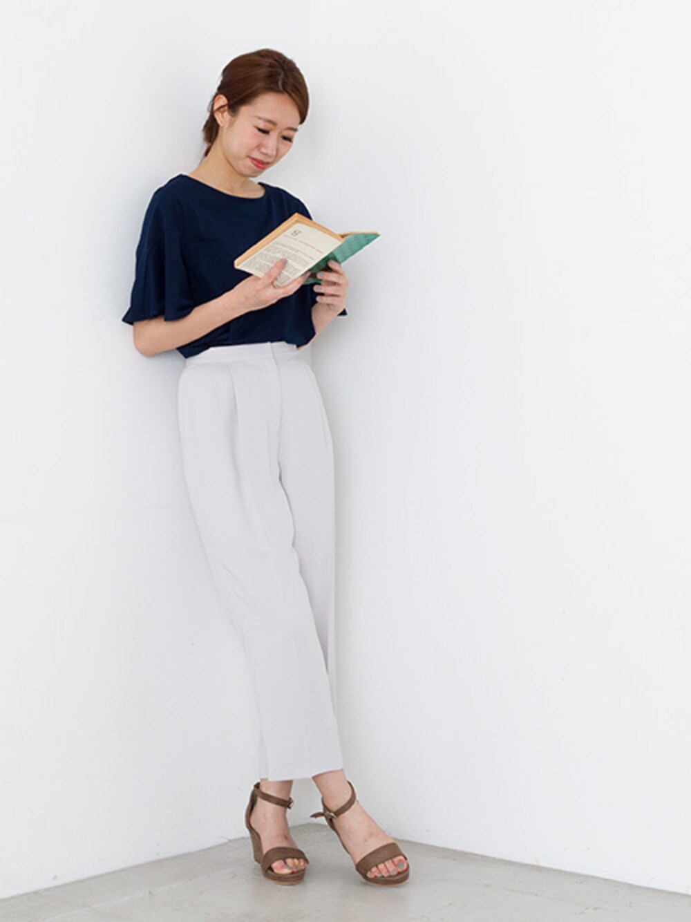 通勤パンツコーデ フリルスリーブのカットソーと合わせて、パンツスタイルも女性らしく。
