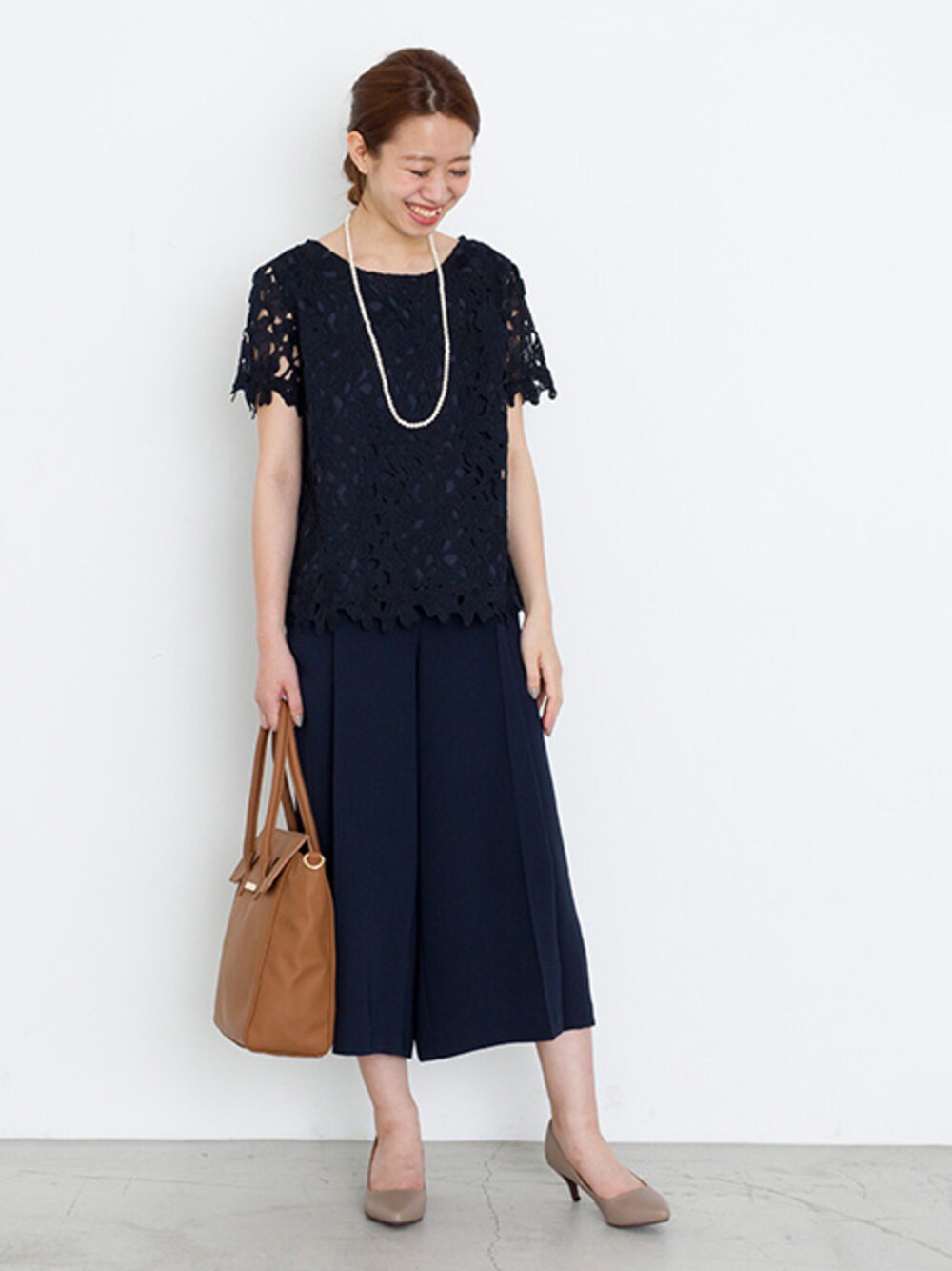 女性らしいレーストップスに、滑らかな風合いのワイドパンツを合わせたきちんとコーデ。 パールのネックレスで華やかさをプラス。