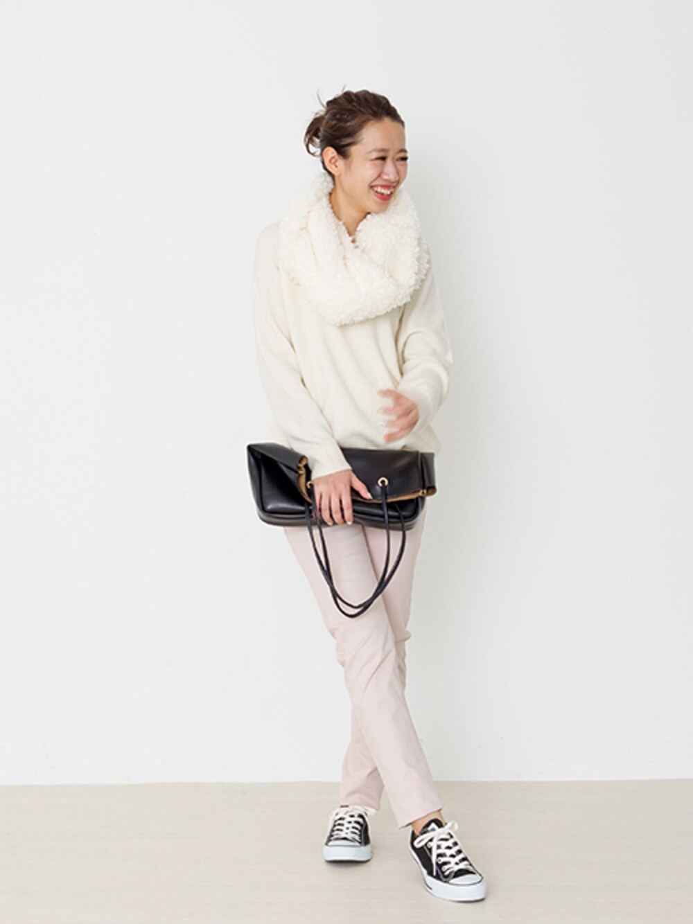 ニット×スキニーパンツのシンプルスタイルには、今年らしいボアスヌードでアクセントをプラス♪