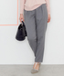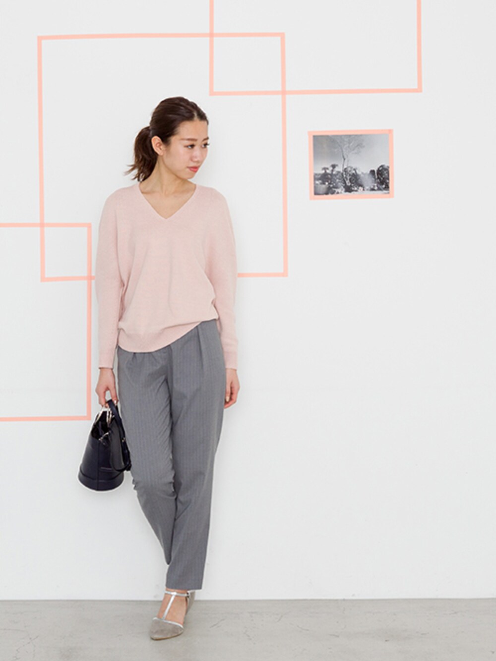 抜け襟KNITのカラー別コーデ! 女性らしいフォルムの抜け襟ニット。春らしいピンクには、グレーパンツを合わせてフェミニンに。