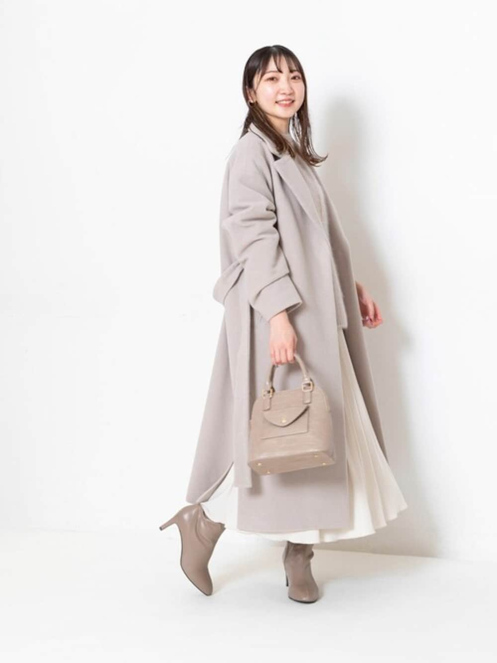 全体をふんわりとやさしいトーンでまとめながら、甘くなりすぎないようにアウターはチェスターコートにすることで、全体をピリッとシャープに引き締めてくれます。お仕事シーンにはもちろん、ちょっと小さめバッグをあわせて冬のお出かけシーンにもおすすめです。