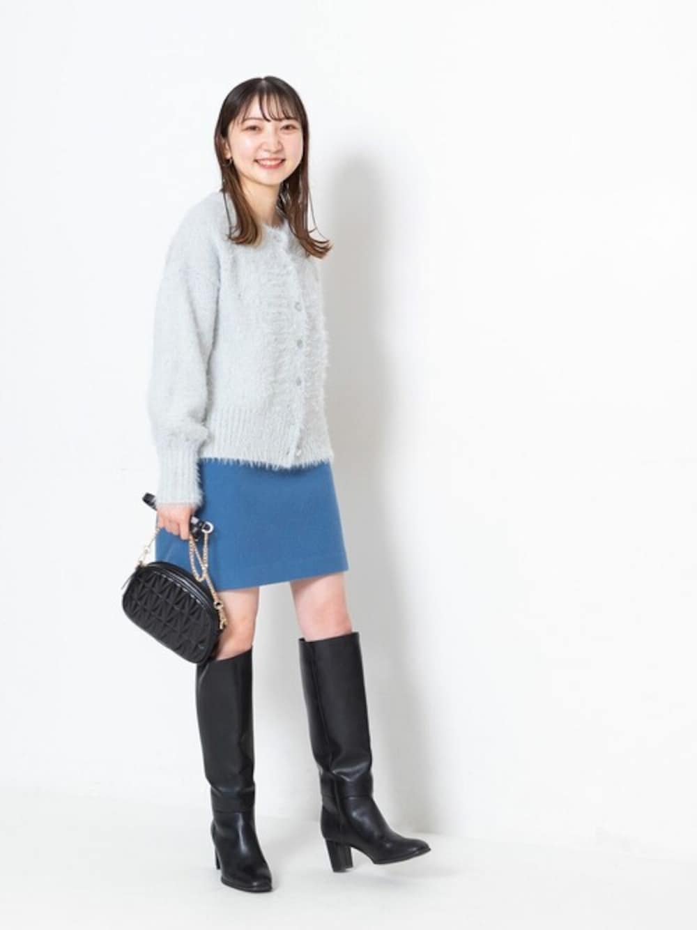 MIX感のある糸とふわふわフェザーで表情のあるニットカーディガンは、前を全部とめてプルオーバー風に。ロングブーツ人気とともに、ミニスカートもこの冬気分♪カーディガンにあわせてブルーのワンカラーコーデにまとめました。カーディガンの甘さを黒小物でピリッと引き締めて大人顔に♪