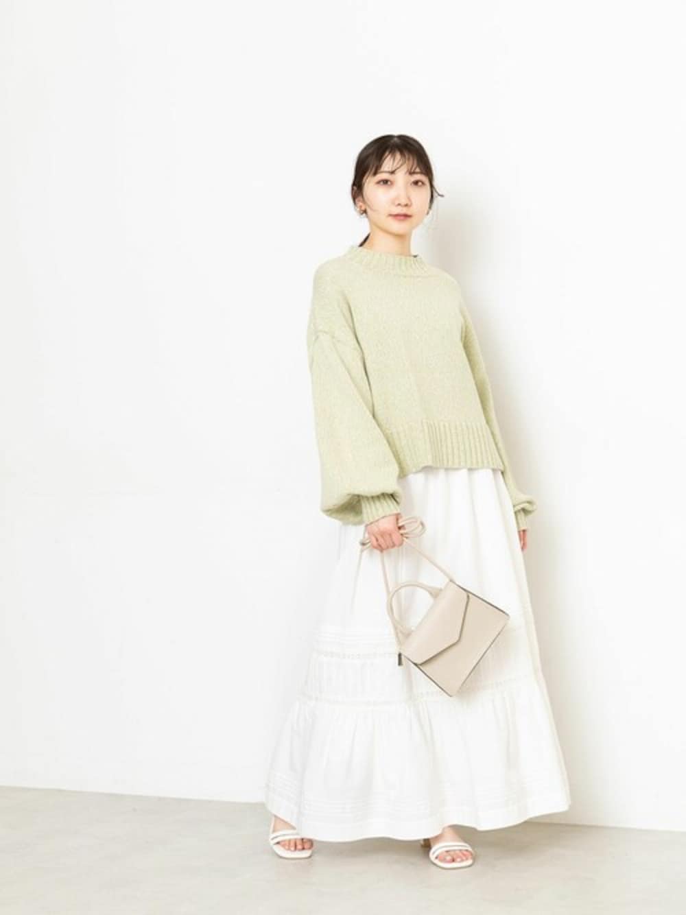 ピンタックレースとコットンレース使いがこだわりのティアードスカートは程よいボリューム感とコットン素材のナチュラルムードが春から初夏まで楽しめるスカートです。150cmで Mサイズ着用すると、足首にかぶるくらいのたっぷりとした長さになって贅沢感があります。着丈が気になる場合はSサイズがおすすめ♪ゆったりゴム仕様なのもリラクシーなムードにぴったりです。まだ春先の寒暖差がある季節には、ボリュームニットをあわせてさっそく春コーデに取り入れます!