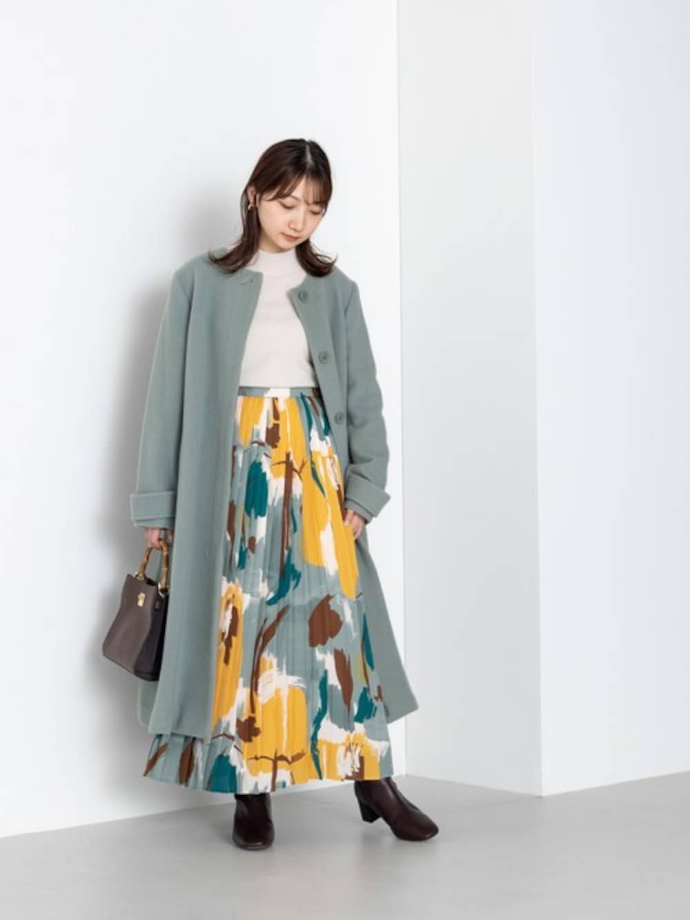 バックタックが贅沢なフレア感を演出してくれるノーカラーコート♪低身長さんにも好バランスで着られるプチサイズ着用です◎ウール高混率で暖かく、ロング丈でも軽やかに着られます。今回は通勤時でも取り入れやすいスモーキーカラーをチョイスしました。コートの中からのぞく、カラフルなモダンアート柄のスカートが目を引きコーデの主役に♪コートのスモーキーカラーともマッチして、派手めのスカートもまとまりがでます。 ※コートは150cm Aroundの低身長さんにおすすめの“petit size” 着用。公式サイト限定カラーになります。