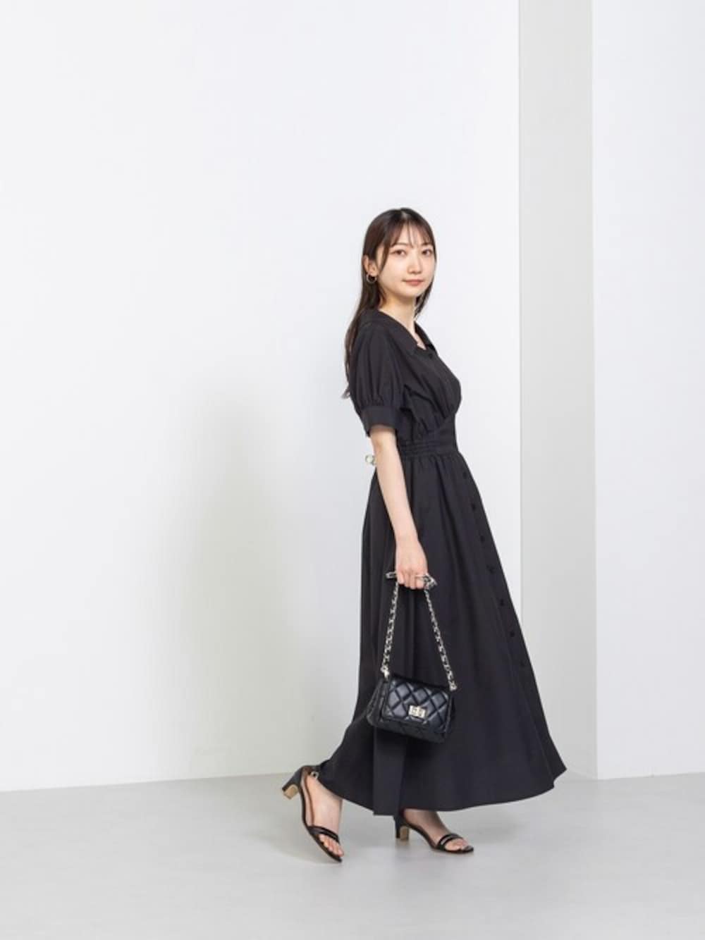 たっぷりとしたフレアシルエットが贅沢なシャツワンピースは、ふんわりと広がるスカートで、夏のブラックコーデでも重さを感じさせないのがポイント。大きめの襟も今年らしいディテールで甘くなりすぎないシャツタイプなので、夏のお出かけだけでなくオフィスにもおすすめです。ヒールをあわせたので長めのMサイズを選びましたが、もう少しスッキリ着るなら着丈の短いPSサイズも◎