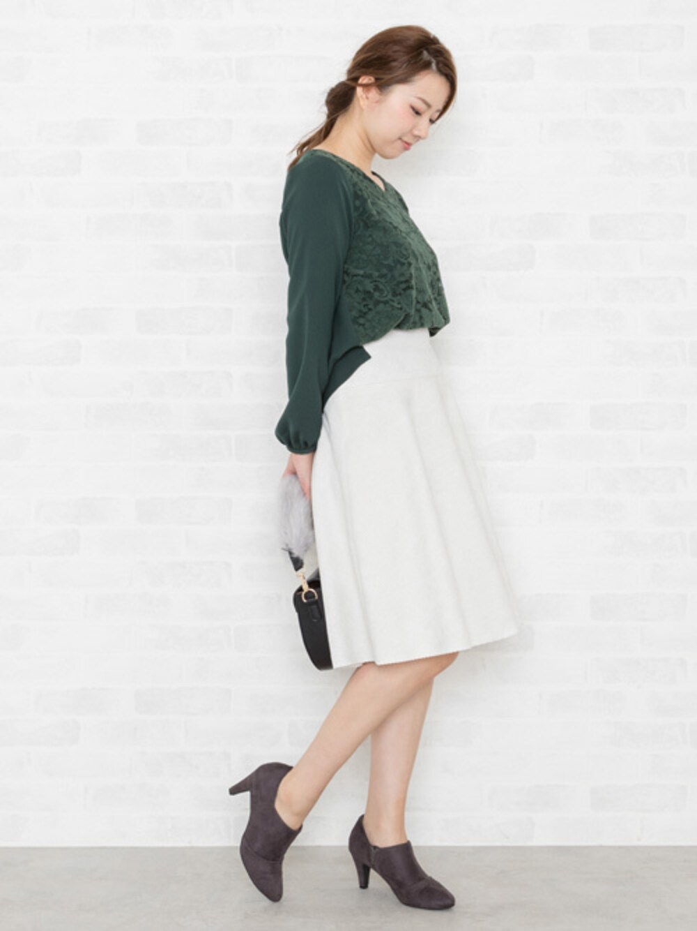フロント部分にフロッキーレースを用いたブラウスはトレンドカラーのダークグリーン。着るだけで華やかさを演出してくれるのでオフィスやおでかけに大活躍です◎