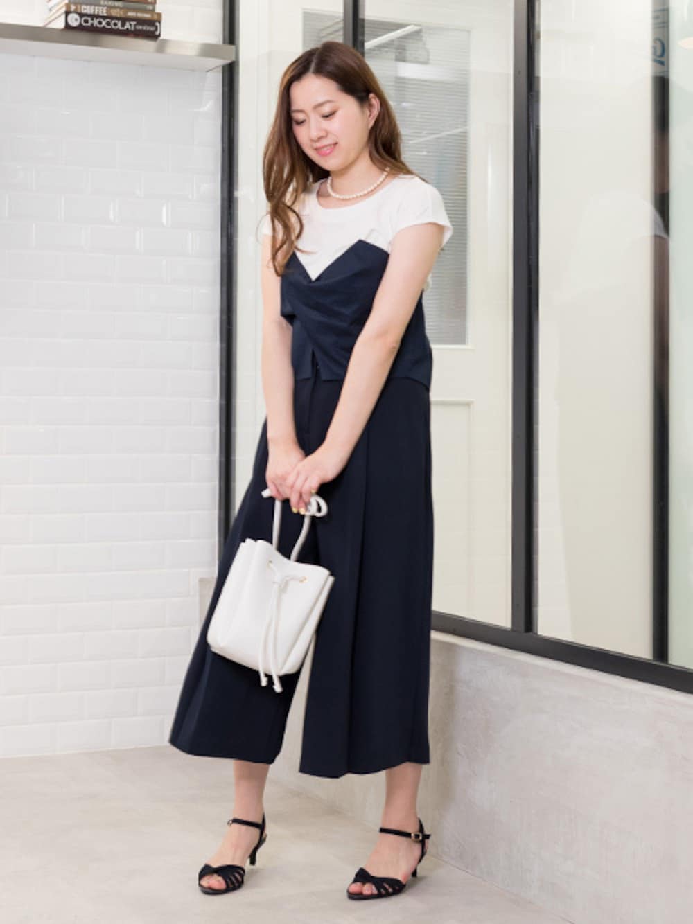 ビスチェ付のTシャツなら難しく考えなくてもワンツーフィニッシュ!でこなれ感を演出してくれます。 白Tシャツもネイビー合わせで品よくまとまりオトナ見え。