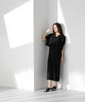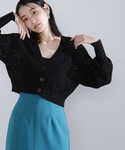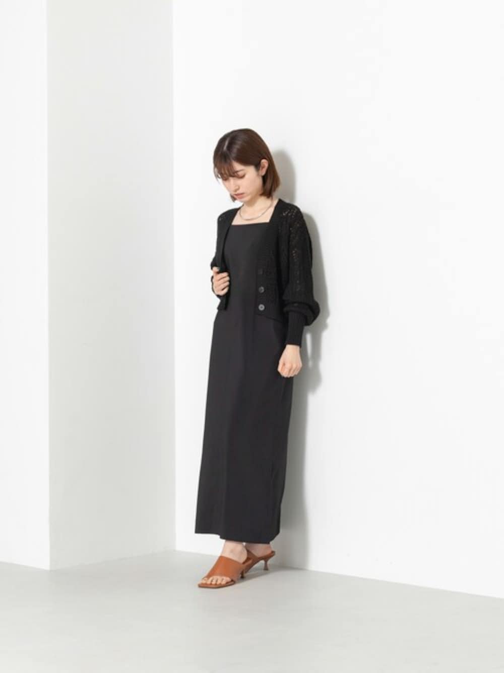 麻混でナチュラルな印象の透かし柄ニットカーデをオールブラックでまとめた大人カジュアルなスタイリング。きらっと光るアクセサリーを合わせて抜け感をプラスしました。透かし柄が涼しげなカーデは着丈が短めなのが今年らしく、ワンピースとも相性抜群のおすすめの1枚です。