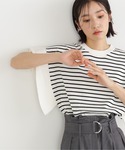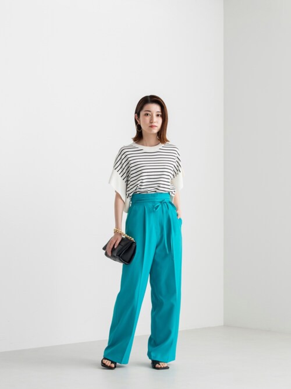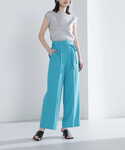 夏らしいボーダー×ターコイズブルーが着映えするコーディネート♪ドロップショルダーのバタフライスリーブは肩回りをカバ。落ち感のあるボクシーなシルエットがキレイ見えするポイントです。涼し気なリネンライクのパンツはワイドシルエットが今年らしい1枚。華奢なリボンベルトがキレイ目な印象で、オフィスカジュアルにもデイリーにもおススメです!