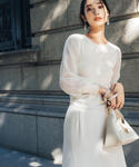 ミニマルなジャンスカにフェミニンなニットを合わせたミックスコーデは、オフ系のワントーンでまとめたのがポイント。シンプルなデザインのジャンスカなので、スリーブにデザインのあるインナーとも相性抜群。合わせるインナー次第でカジュアルからきれいめまで幅広いスタイリングが楽しめる万能なアイテムです。