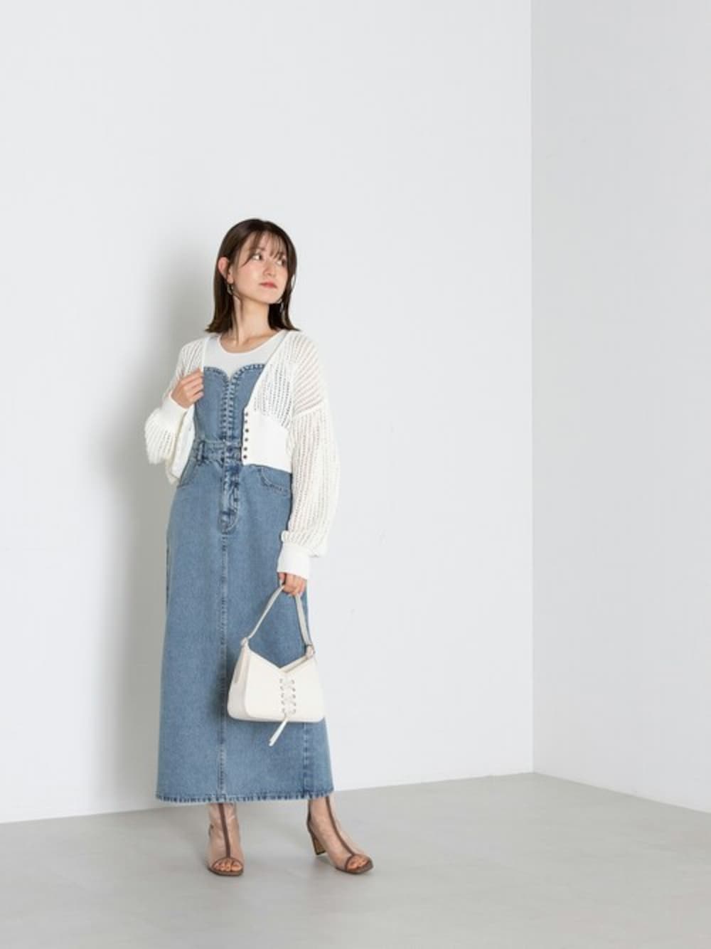 オフ×デニムが爽やかな印象のフェミカジコーデ♪アメスリのニットタンクとカーデのアンサンブルをインナーに合わせて鮮度を出しました。デニムワンピは高めの切り替え位置と、ウエストからヒップにかけてのフィット感がスタイルアップを叶えてくれるおすすめの1枚。足元はシアーブーツでデニムコーデに軽さをプラスしました。
