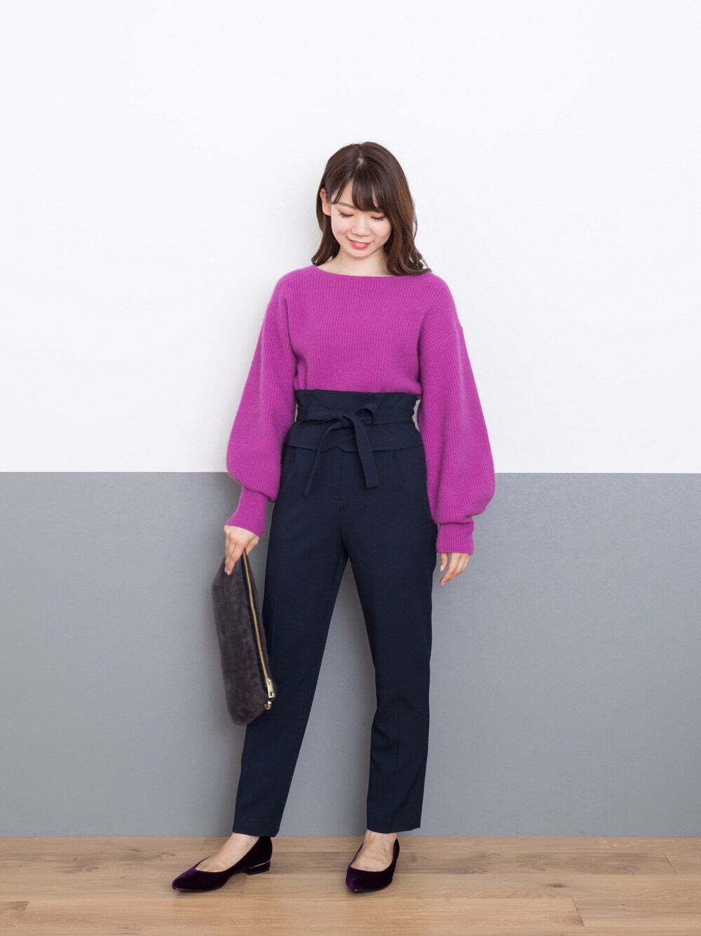 鮮やかなカラーが目を引くフォックス混の畦ニットは、ネックラインをスッキリと、袖のボリュームはたっぷりと、レディなシルエットが人気♪トップスにボリュームがあるので、サッシュベルト付ペグパンツですっきり合わせが◎