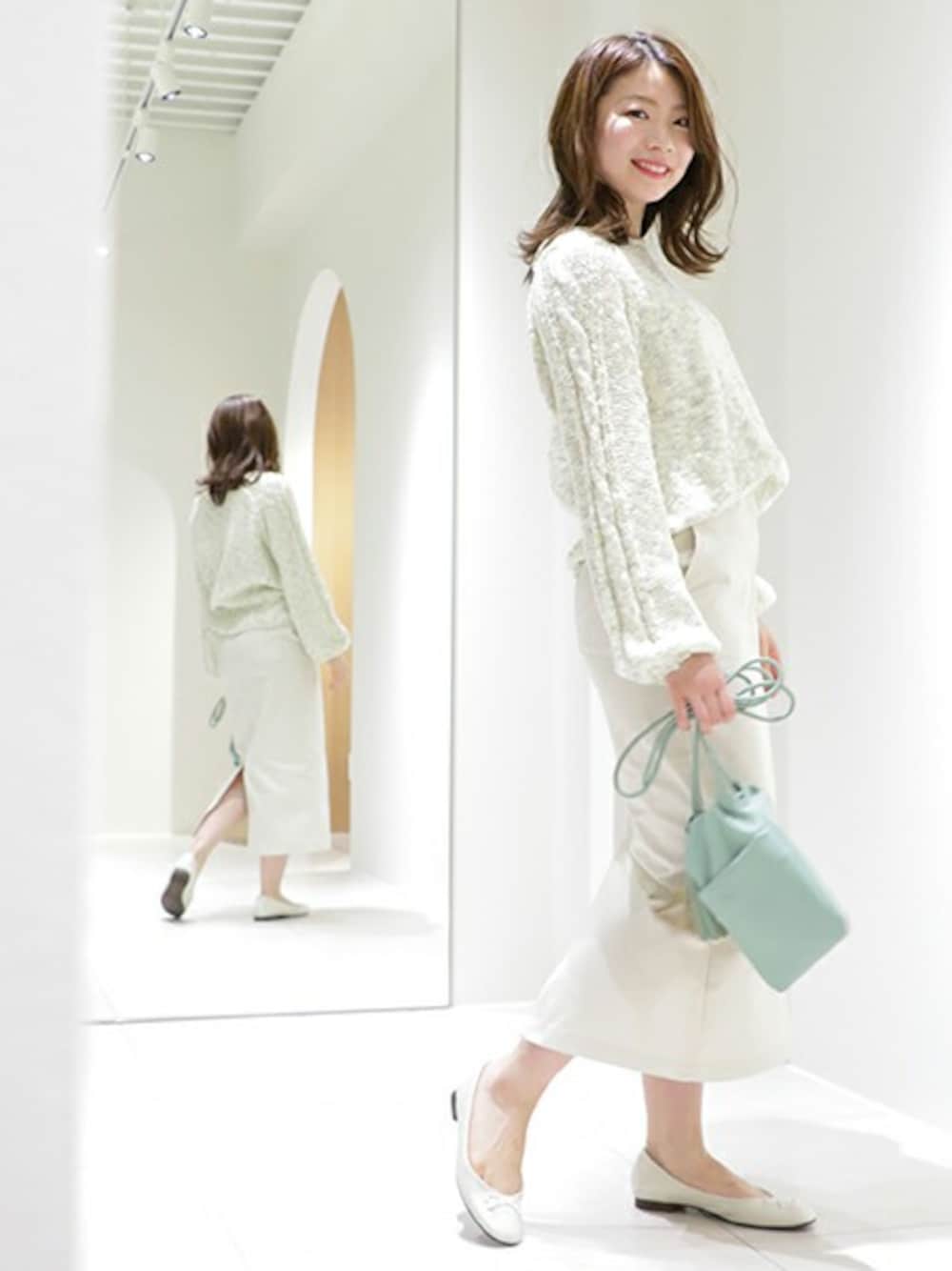 2トーンの糸を使ってMIX感のあるニットは、少し春めいたカラーバリエーションで、いろいろな編み方を組み合わせてこだわった1枚。スリーブにはアクセントとなるケーブルが、裾ラインはガーター編みになっています。表情のあるニットだからこそ、ALL Whiteコーデにしてものっぺりならなくてキレイめカジュアルに!