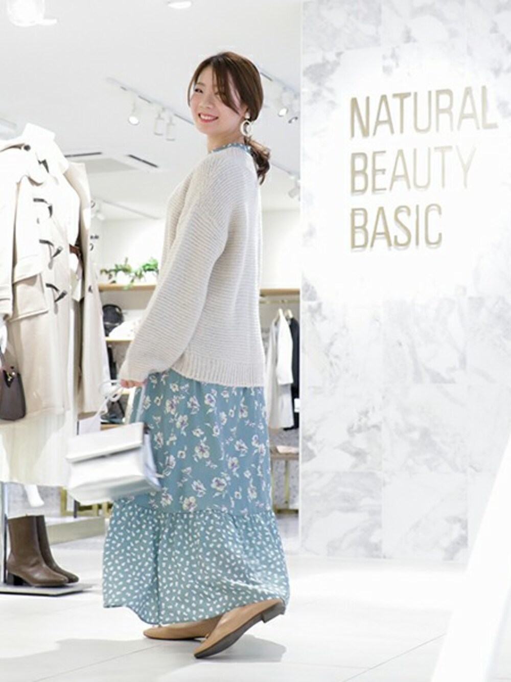 華やかな大きめフラワーと小花プリントの2種類の花柄を切り替えたティアードマキシワンピースはこの冬トレンドのミントカラーで。つややかなサテン素材とざっくりニットの異素材レイヤードも今っぽくておすすめです♪