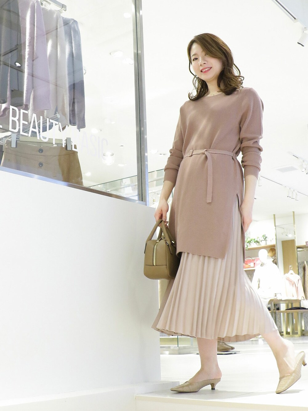ピンクのワントーンコーデもくすみピンクなら上品見え♪プリーツスカートは、春コーデにも引き続き活躍するので、新色をおさえておくのがおすすめです。オフィスに着ていくなら、オーバーサイズのトップスよりも、スッキリとしたシルエットのチュニックニットをレイヤードしてスッキリ見えがおすすめです。
