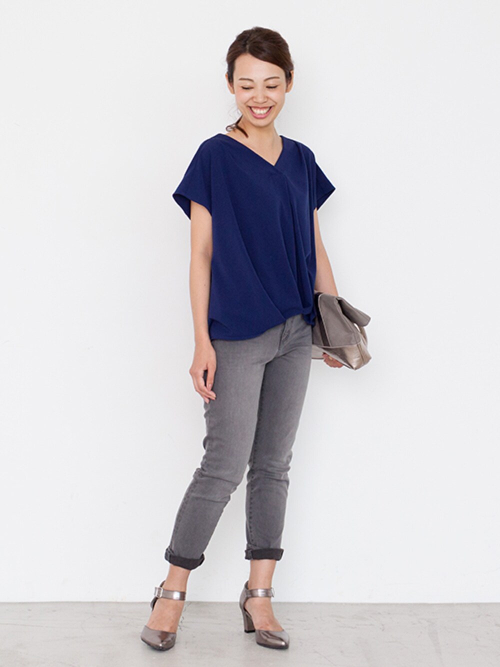 女性らしい抜け感のあるブラウスも、スキニーデニムと合わせればカジュアルにもこなせます。