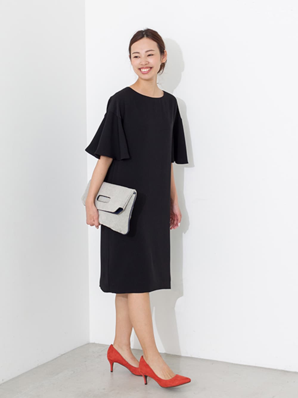 フォーマルシーンにもおすすめのブラックワンピース。軽やかなフレアスリーブで重たい印象にならないところもこの季節嬉しい。