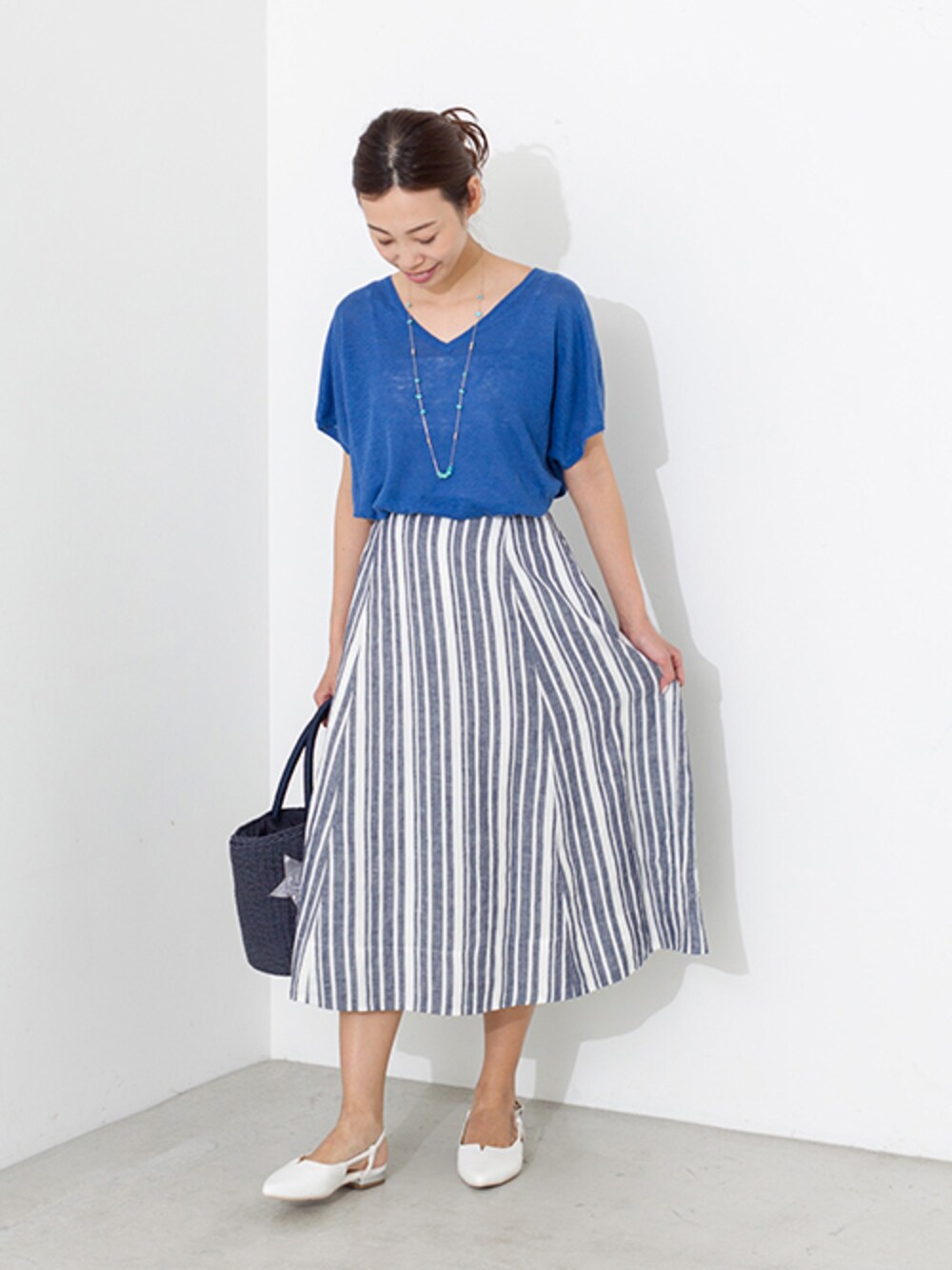 清涼感のあるリネンニットにフレンチリネンのスカートをブルーベースでコーディネート♪清涼感ある初夏気分にまとめます。