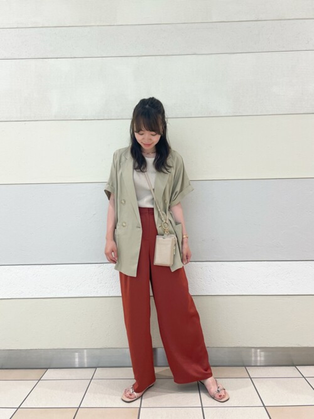 麻混のハーフスリーブジャケットにサテンのタック入りパンツのリラックスコーディネートです! テラコッタカラーのパンツは差し色はもちろん、トップスは黒にしてダークサマーにしてもお洒落度アップ♪ ウエストバックがゴムで普段はXSを着ることが多い私ですがSサイズで綺麗に穿けましたのでぜひ参考にしてみてください! 【着用サイズ】 ・トップス:M ・ジャケット:S ・パンツ:S ・サンダル:S **************** 【普段サイズ】 ・トップス:S〜M ・ボトムス:XS〜S ・シューズ:22.5〜23/S〜M