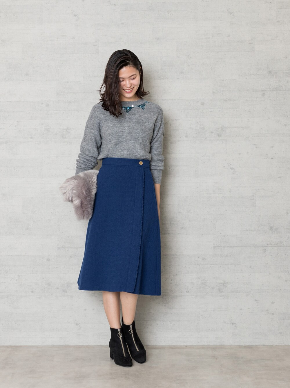 ネックラインの華やかなスパンコールとスカートのカラーでリンクコーデ♪首元が煌びやかだと顔色も明るくなって◎スカートは人気のミモレ丈で巻き風デザインとフリンジ使いがカジュアルな着こなしにもマッチする1枚です。