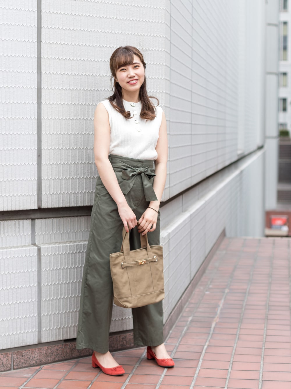 ウエストラインをリボンでギュッと結んでスタイルアップ効果もあるワイドパンツは、晩夏も見据えてカーキが気分♪表面感のあるサマーブークレニットはフロントラインの大きなゴールドボタンがトップス&ボトムスのシンプルコーデを格上げしてくれます。