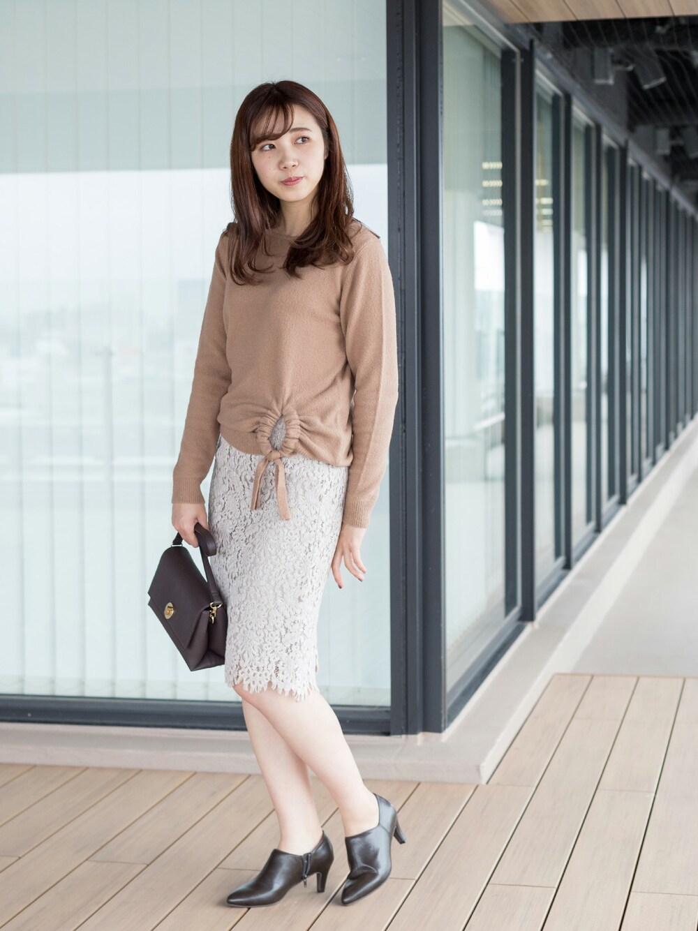 温かみのあるモール糸のレースで仕上げたタイトスカートは、ますます寒くなるこれからの時期にもおすすめ。ドロストディテールがアクセントになったニットをあわせたシンプルコーデでオフィスカジュアルにも♪