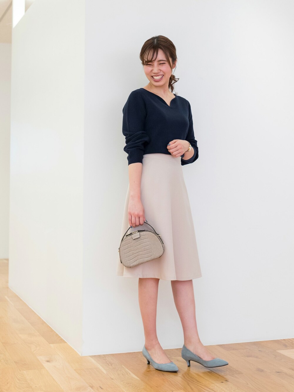品の良いひざ丈のフレアスカートは、トップスを選ばず、シンプルなオフィススタイルには欠かせない1枚。カッチリとしたイメージのネイビーニットも、春らしい明るめのベージュが優しい印象にまとめてくれます。